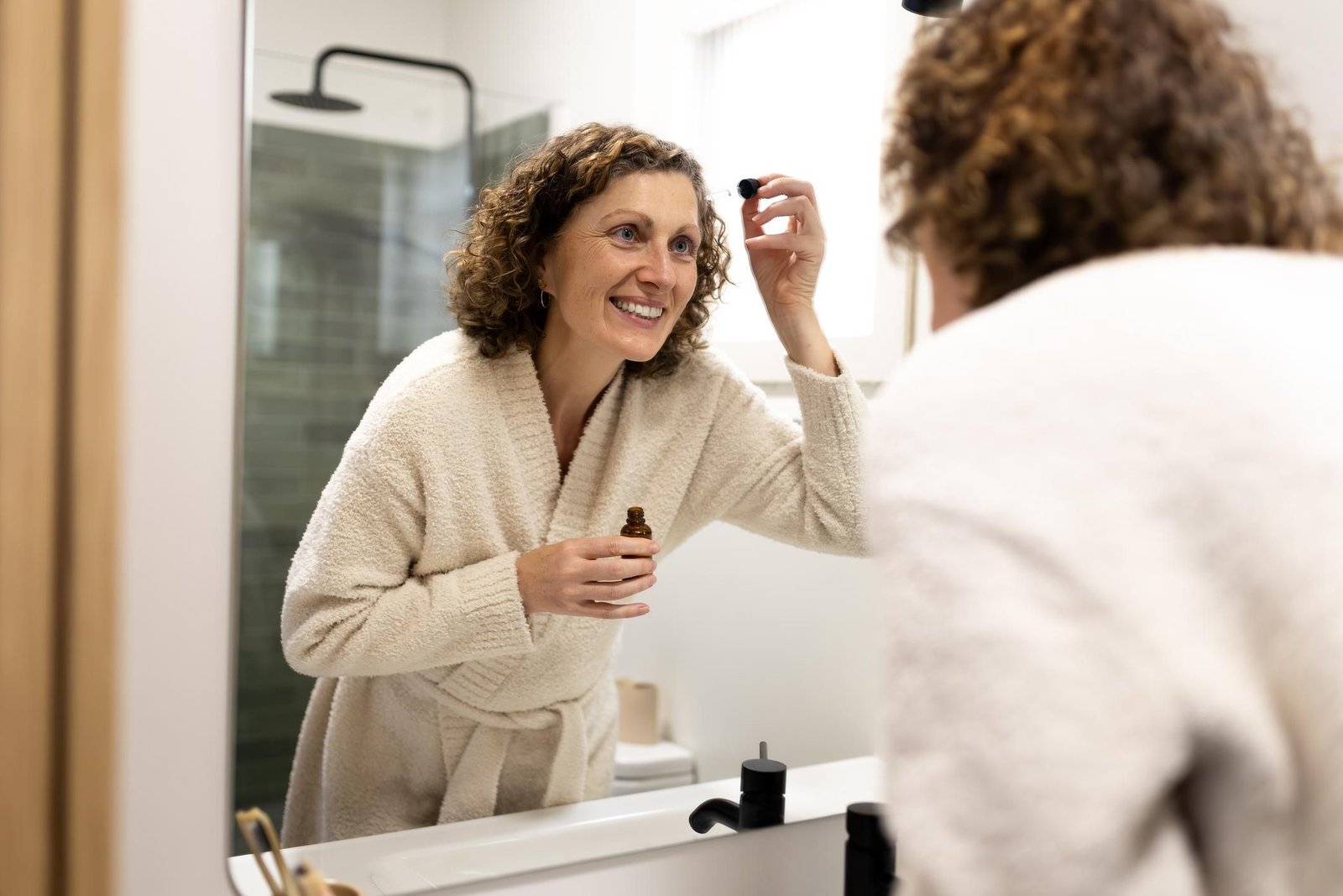 They begin using vitamin C in the morning to support brightness. At night, they use retinol to support skin renewal.